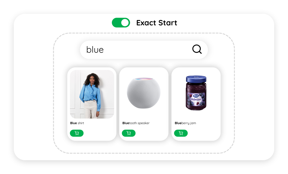 With Exact Start, search results that exactly match the beginning of a visitor’s query are prioritized.