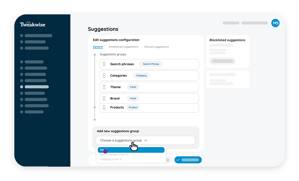 The Suggestions module has been completely updated and is now neatly organized in the Tweakwise App. Where previously you worked with separate sections like Established, Manual, and Blacklisted Suggestions, these are now combined in one central module.