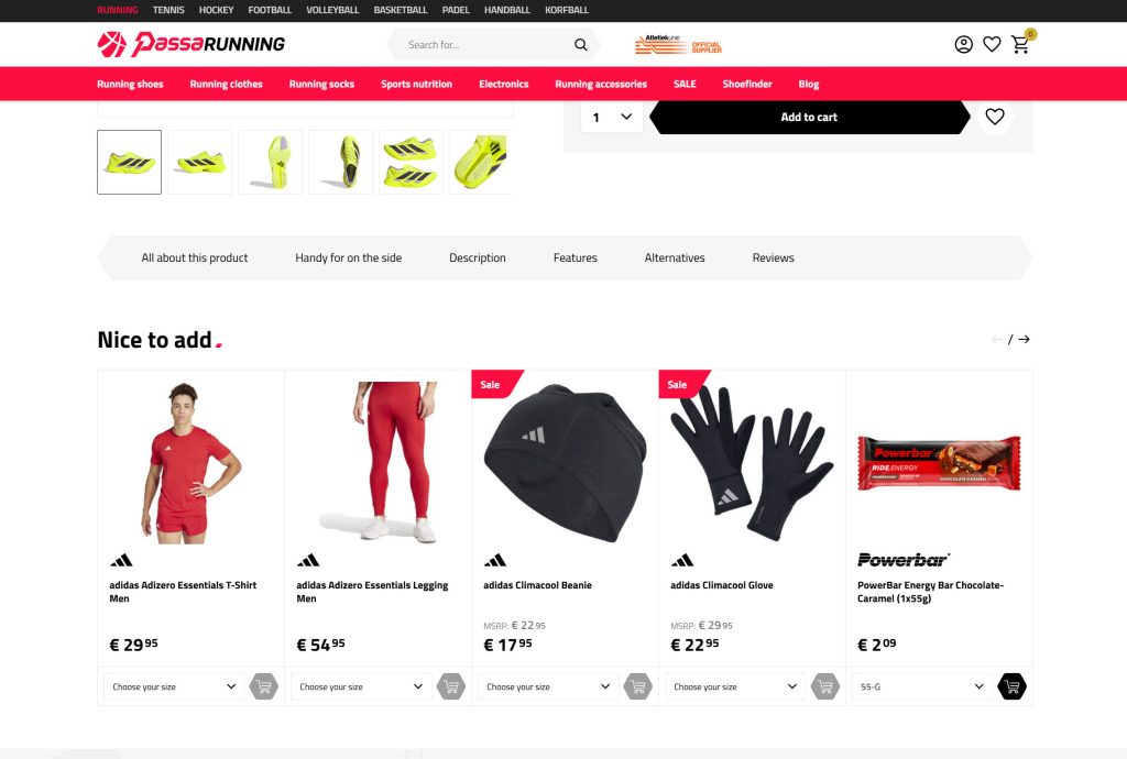 Search werd zorgvuldig geïmplementeerd en daarna intensief geoptimaliseerd. Recommendations zijn slim ingericht met een beperkt aantal regels, waardoor het beheer drastisch is vereenvoudigd. Guided Selling is volledig in JavaScript opgezet en visueel afgestemd op de huisstijl van PassaSports, met productfinders voor onder andere padel, running en voetbal.
